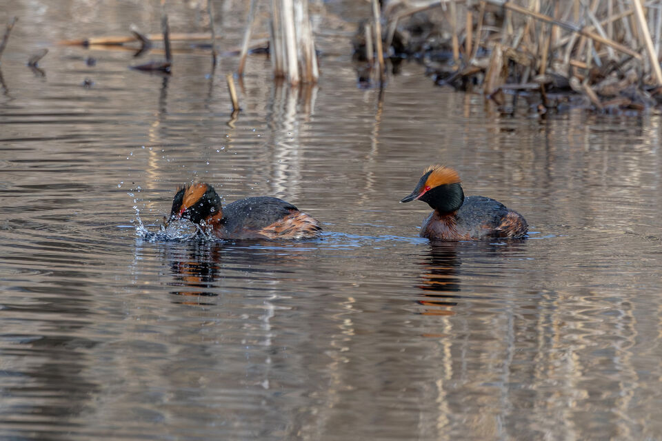 Skäggdoppingparet kom simmande mot mej när jag stod vid bron i Hjälstaviken. Det var dimmigt och naturens färger var dämpade.