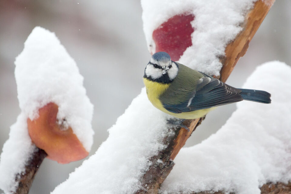 Blåmesen var inte alls nöjd med snön som täckte större delen av äpplena som den så gärna vill komma åt.