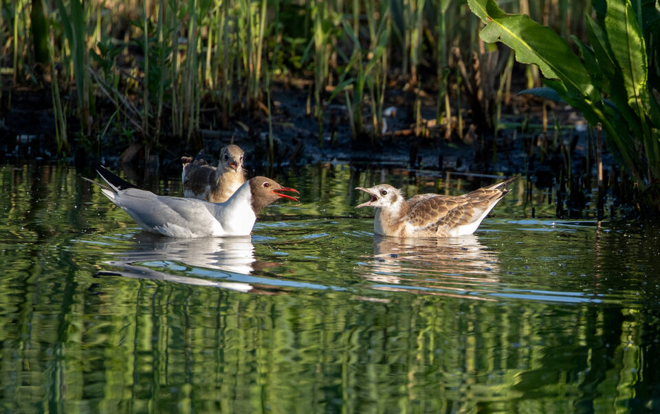 Skrattmåsarnas ungar har nu blivit så stora att de börjat flyga, men mat förväntar de sej fortfarande av sina föräldrar och de påtalar det med stor övertygelse.