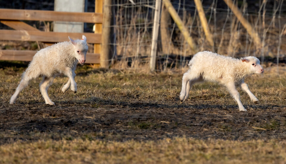 Unga lamm som spritter av nyfikenhet och livslust. Solen är på väg att gå ner och det var som att de måste göra några några extra skutt innan kvällsvilan.