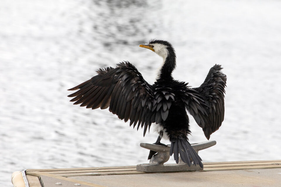 Svartvit skarv finns bl a i Indonesien, Australien och på Nya Zeeland. Jag hittade några bilder på en sådan i arkivet. Här sitter den och torkar fjädrarna i småbåtshamn i Melbourne.